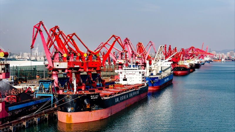 在山东港口日照港煤炭泊位,货轮停泊卸煤(2024年12月4日摄,无人机照片)。新华社记者 郭绪雷 摄