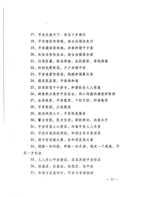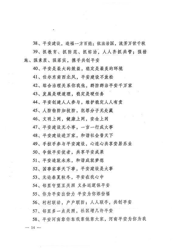 平安两字重千斤,社会稳定得民心。 创建平安人人有责,构建和谐人人参与。