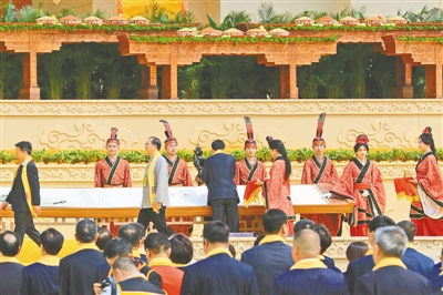 祈福中华。拜祖台上,一幅波涛壮阔的黄河画卷徐徐展开。古小玉、何新、刘家强、符之冠、陆进、徐显明、孙达,中央统战部九局二级巡视员孙彦涛,国家文化和旅游部一级巡视员王鹤云,中国工程院院士、全国勘察设计大师何镜堂,中国工程院院士、第二届国医大师王琦,中国工程院院士、华东合成生物产业技术研究院负责人郑裕国,全国政协委员、北京大学教授张颐武,中国文联书记处原书记、中国电影家协会分党组原书记张宏,中国美术家协会分党组书记、中国美术家协会副主席马锋辉,中国戏剧家协会分党组书记、驻会副主席陈涌泉,中国食品药品企业质量安全促进会会长毛振宾,国学专家、讲席教授、北京中医药大学国学院创院院长张其成,知名学者、浙江大学求是特聘教授郑强,资深媒体专家胡锡进,中欧经济文化研究发展中心会长柯海啸,中国男高音歌唱家、河南音乐学院院长戴玉强,河南邓亚萍体育产业投资基金董事长邓亚萍,全国政协委员、知名作家蒋胜男,首届岐黄学者、河南中医药大学校长王耀献,全国人大代表、依文集团董事长夏华,同仁堂集团董事长王贵平,香港中资基金业协会会长连少冬,中铁工程装备集团有限公司董事长赵华,国家级非物质文化遗产石雕项目代表性传承人刘红立,在画卷上盖印,以黄河为证,祝福国家安泰、海宇宁谧。